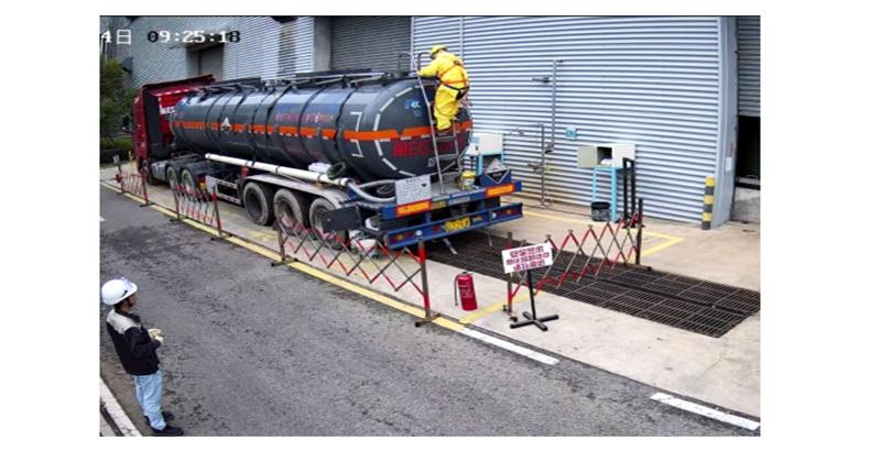 槽車到位后識別圍籬、滅火器、警示標(biāo)識、人員著裝規(guī)范等。